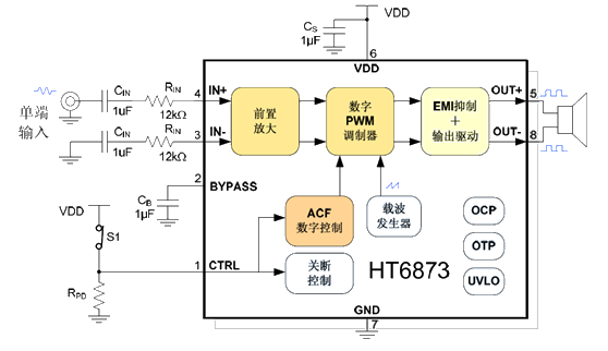 UTC5813是一款高保真超低EMI的,具有防削頂失真功能的單聲道免濾波D類音頻功率放大器。在5V電源,10% THD+N,4Ω負載條件下,輸出3.5W高功率,在各類音頻終端應用中維持高效率并提供AB類放大器高保真、低噪聲的性能。